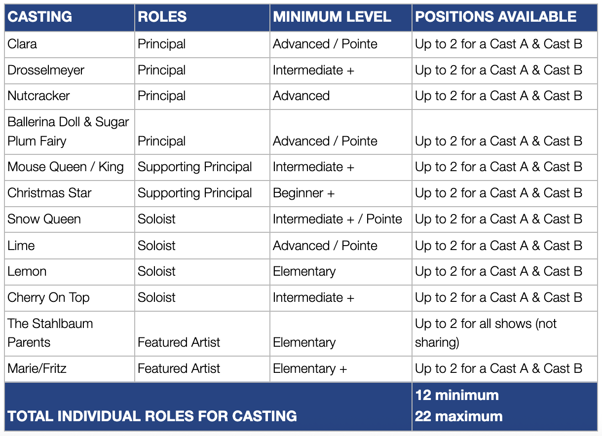 2026 offers up to two roles (one each for Cast A & B) for all Principal Roles, Supporting Principals, Soloists and Featured Artists. The maximum numbers of roles to hand out are awarded at 6th Position’s discretion and are not compulsory to fill. if you are awarded a role to share, you will perform once in Cast A or B in the distinct role and then the other as corps de ballet.